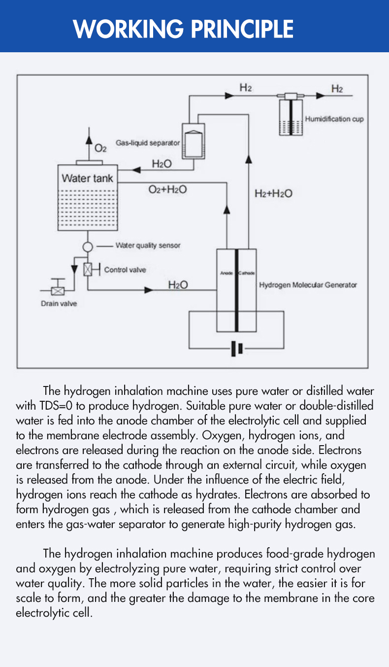 The hydrogen inhalation machine uses pure water or distilled water with TDS=0 to produce hydrogen. Suitable pure water or double-distilled water is fed into the anode chamber of the electrolytic cell and supplied to the membrane electrode assembly. Oxygen, hydrogen ions, and electrons are released during the reaction on the anode side. Electrons are transferred to the cathode through an external circuit, while oxygen is released from the anode. Under the influence of the electric field, hydrogen ions reach the cathode as hydrates. Electrons are absorbed to form hydrogen gas , which is released from the cathode chamber and enters the gas-water separator to generate high-purity hydrogen gas.